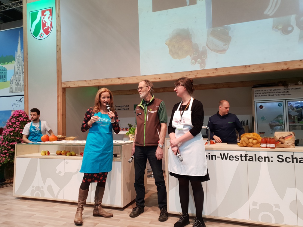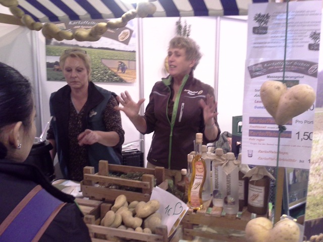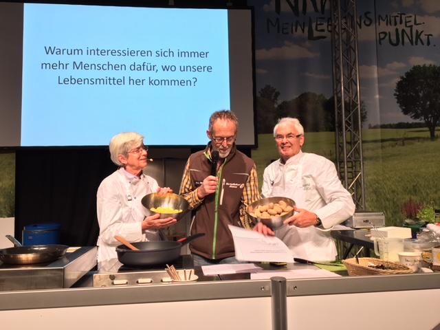 Spannend wurde es dann für uns, als wir uns beteiligen konnten an einer Kochshow auf der Bühne der Halle, wo wir gleichzeitig viele Fragen rund um die Kartoffel und Regionalvermarktung beantworten konnten. Dies war auch in Berlin DAS große Thema: Nachhaltiger Anbau, hofnahe Vermarktung, kurze Transportwege.............